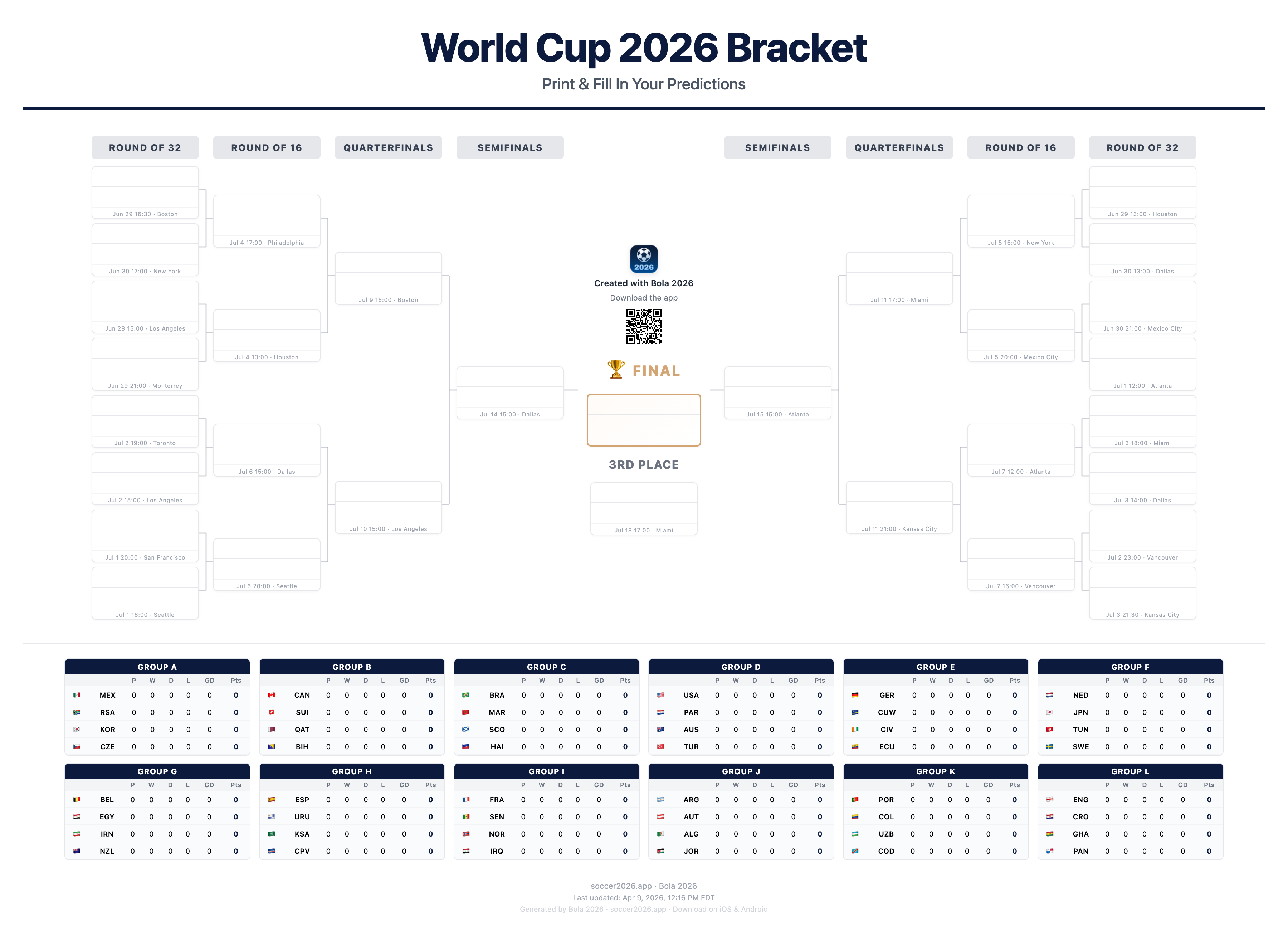 Free printable bracket with all 48 teams, 12 groups, and the complete knockout stage. Updated after every match during the tournament.